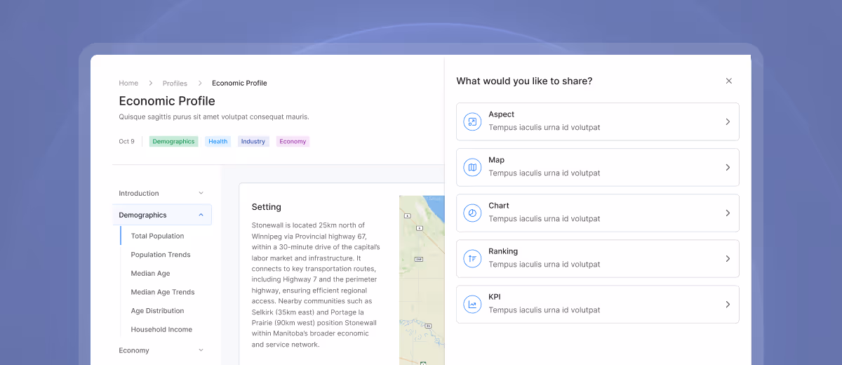 Today’s municipal staff are under pressure to turn complex data about their community into accurate, engaging content – without the time or tools to do it well. Our new platform provides ready-to-use charts, maps, profiles, and explanations that staff can drop directly into reports, presentations, websites, requests for information, and more. Save hours.